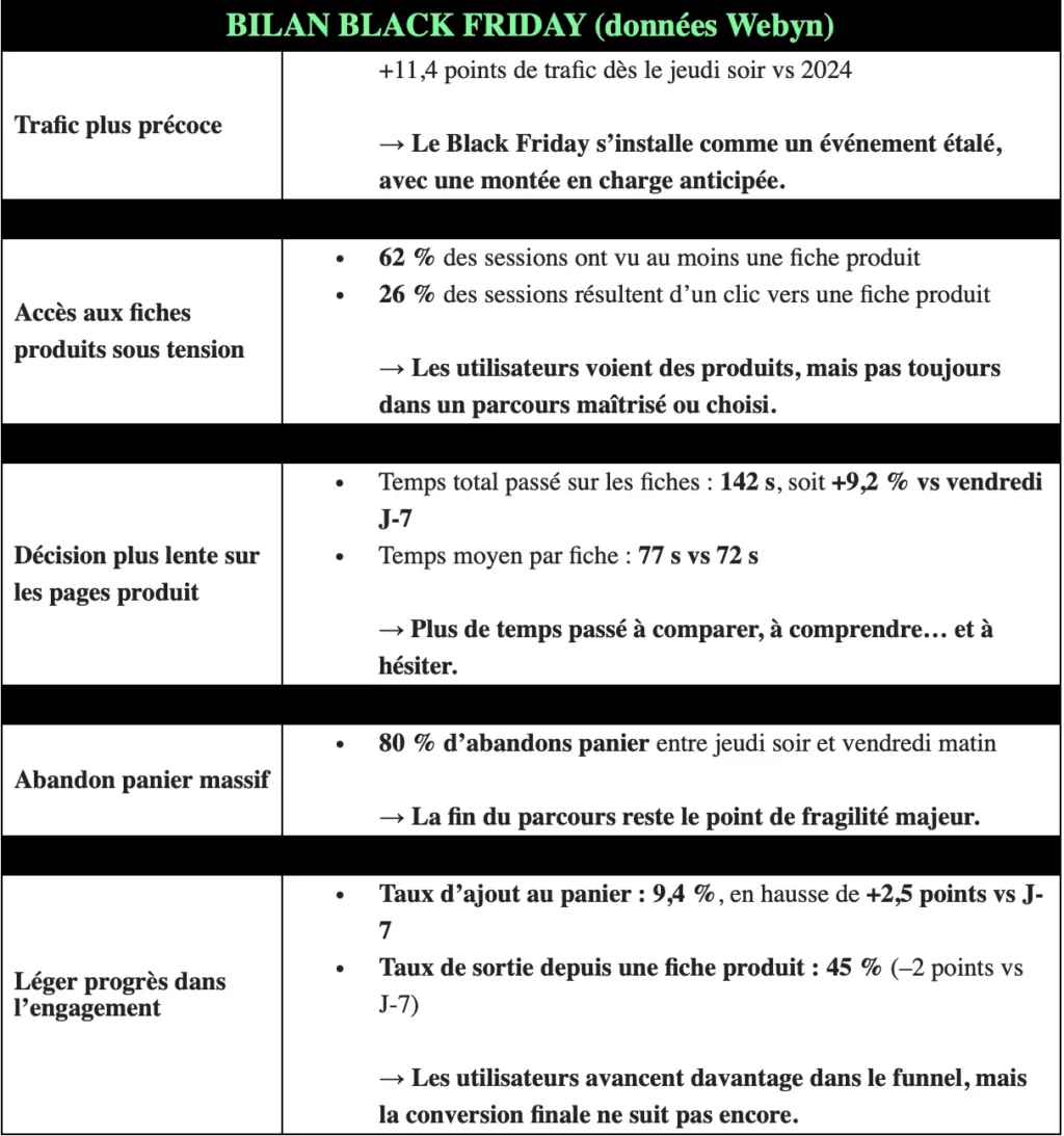 Selon les analyses de Webyn, le trafic a progressé de +11,4 points dès le jeudi soir par rapport à 2024, confirmant l’installation d’un Black Friday étendu sur plusieurs jours plutôt que concentré sur le seul vendredi.