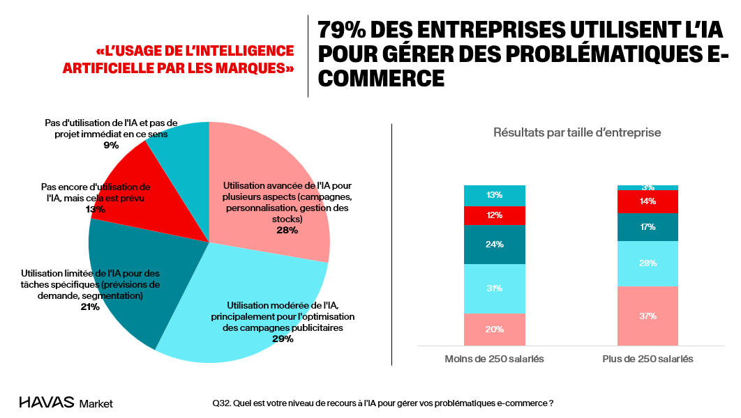 Près de 80 % des marques utilisent l’IA pour gérer leurs opérations e-commerce (stable vs 2024), notamment la gestion des stocks, la personnalisation et l’optimisation des campagnes.