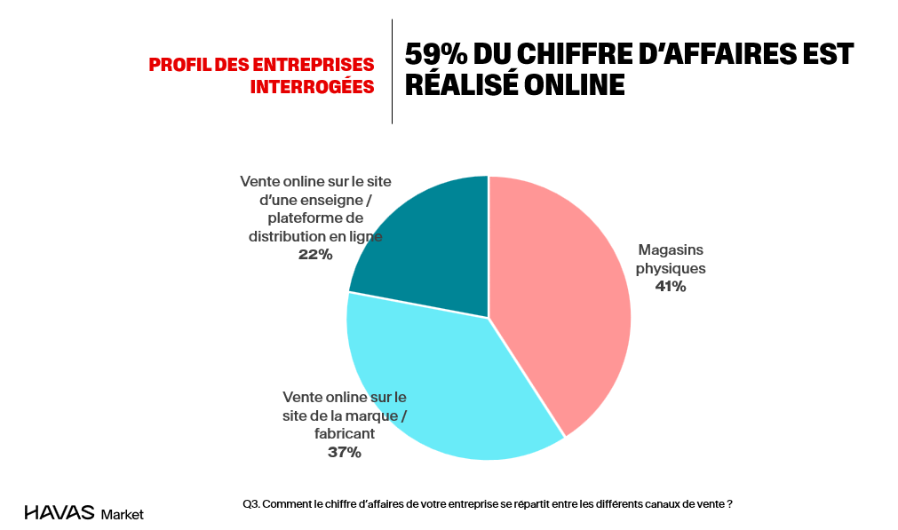 D’une manière générale, 59 % du chiffre d’affaires se génère désormais en ligne, et 83 % des entreprises constatent une progression des ventes online ces trois dernières années.