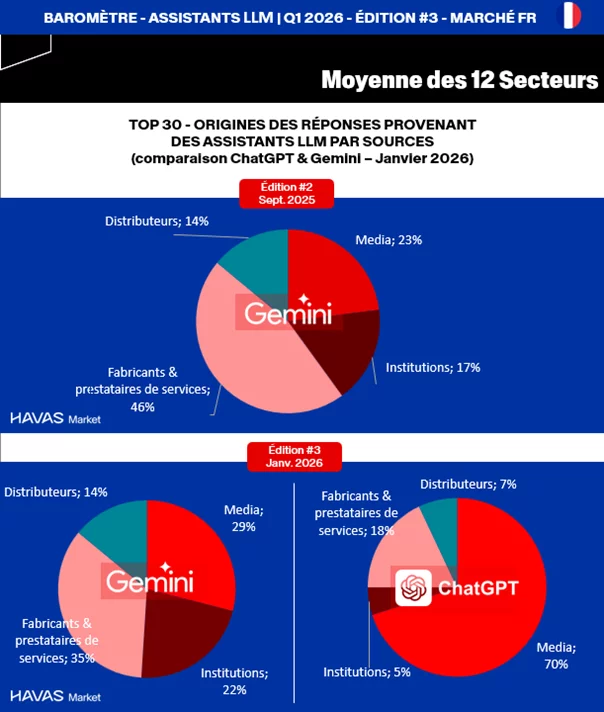 L’intégration de nouveaux modèles comme ChatGPT accentue cette dynamique, en renforçant le poids des médias et des plateformes de référence au détriment des sources institutionnelles et corporate dans plusieurs univers.
