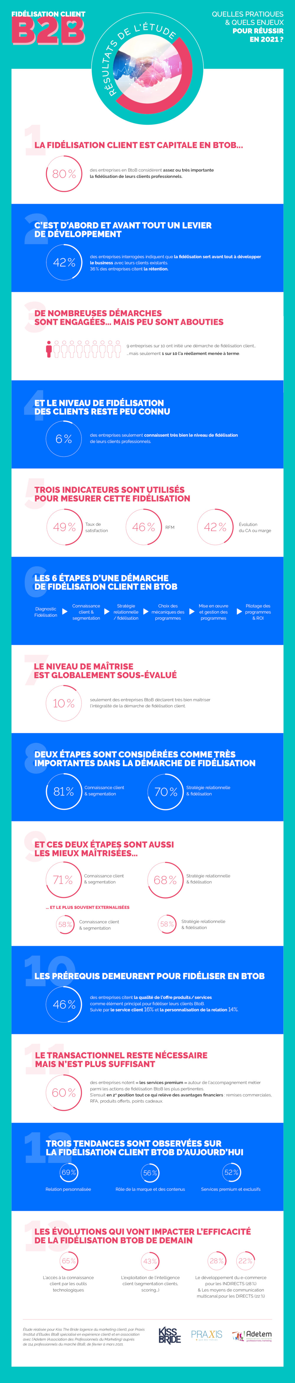 L’agence Kiss The Bride, en partenariat avec l’Adetem et Praxis publient leur rapport complet sur les résultats de l’étude « Fidélisation Client BtoB : quels enjeux et quelles pratiques pour 2021 ? »