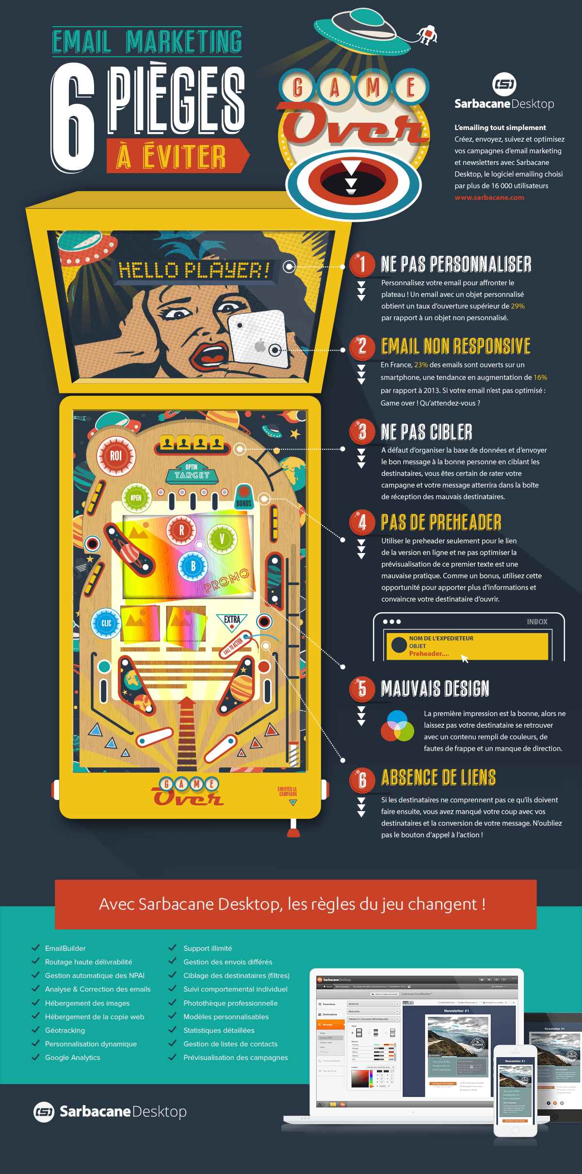 Personnalisation, ciblage, design, code… : Sarbacane vient d’éditer une infographie reprenant les 6 pièges à éviter pour maintenir la performance de ses campagnes emails.
