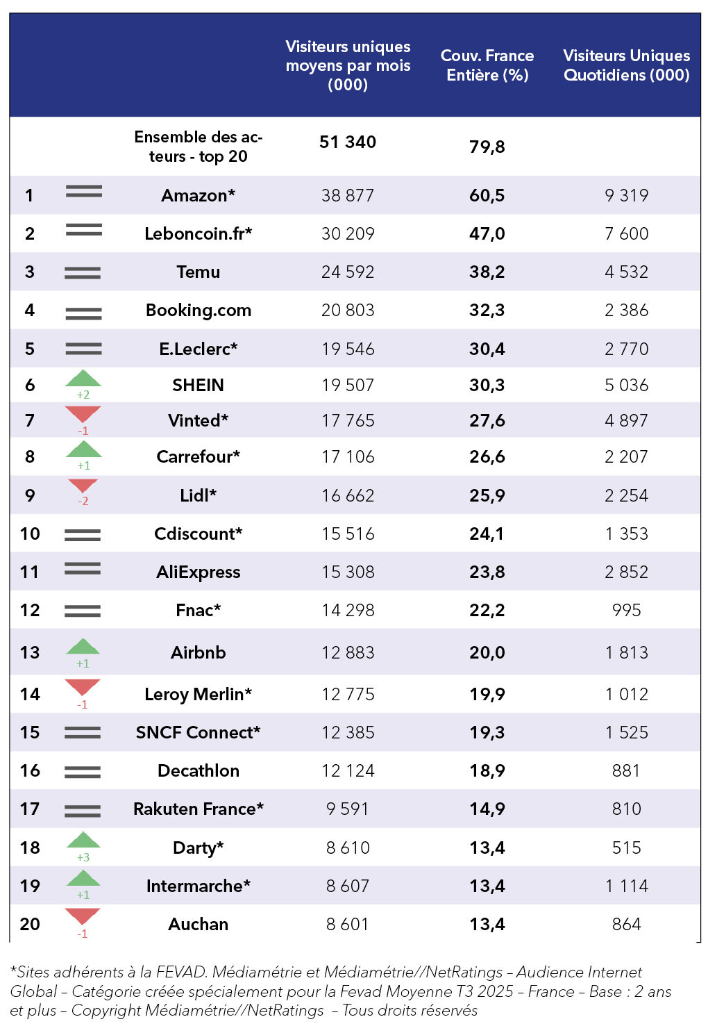 TOP 20 SITES ET APPLICATIONS « E-COMMERCE » LES PLUS VISITES EN FRANCE – INTERNET GLOBAL – 3ème TRIMESTRE 2025 – MEDIAMETRIE x FEVAD
