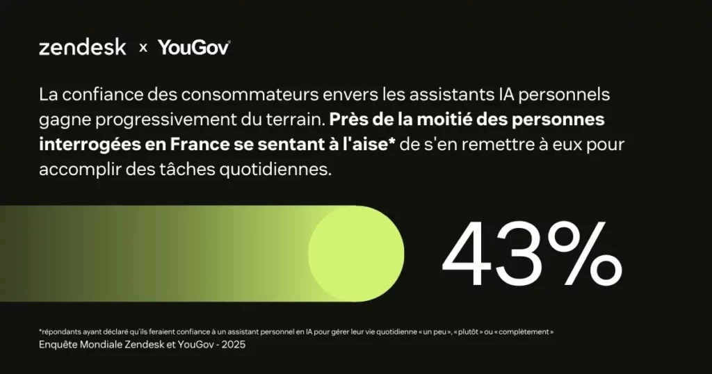 Une nouvelle étude mondiale menée par YouGov pour Zendesk révèle que l’adoption des assistants personnels basés sur l’IA progresse en France, mais que les consommateurs posent des limites claires à leur utilisation.