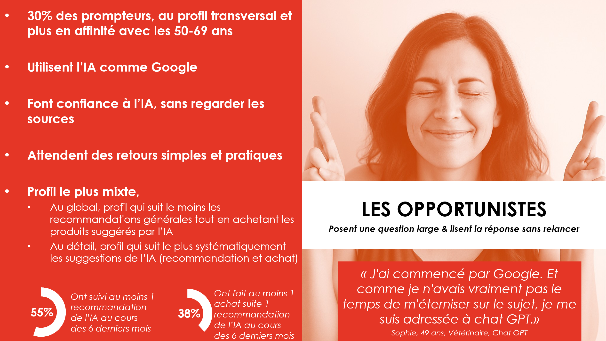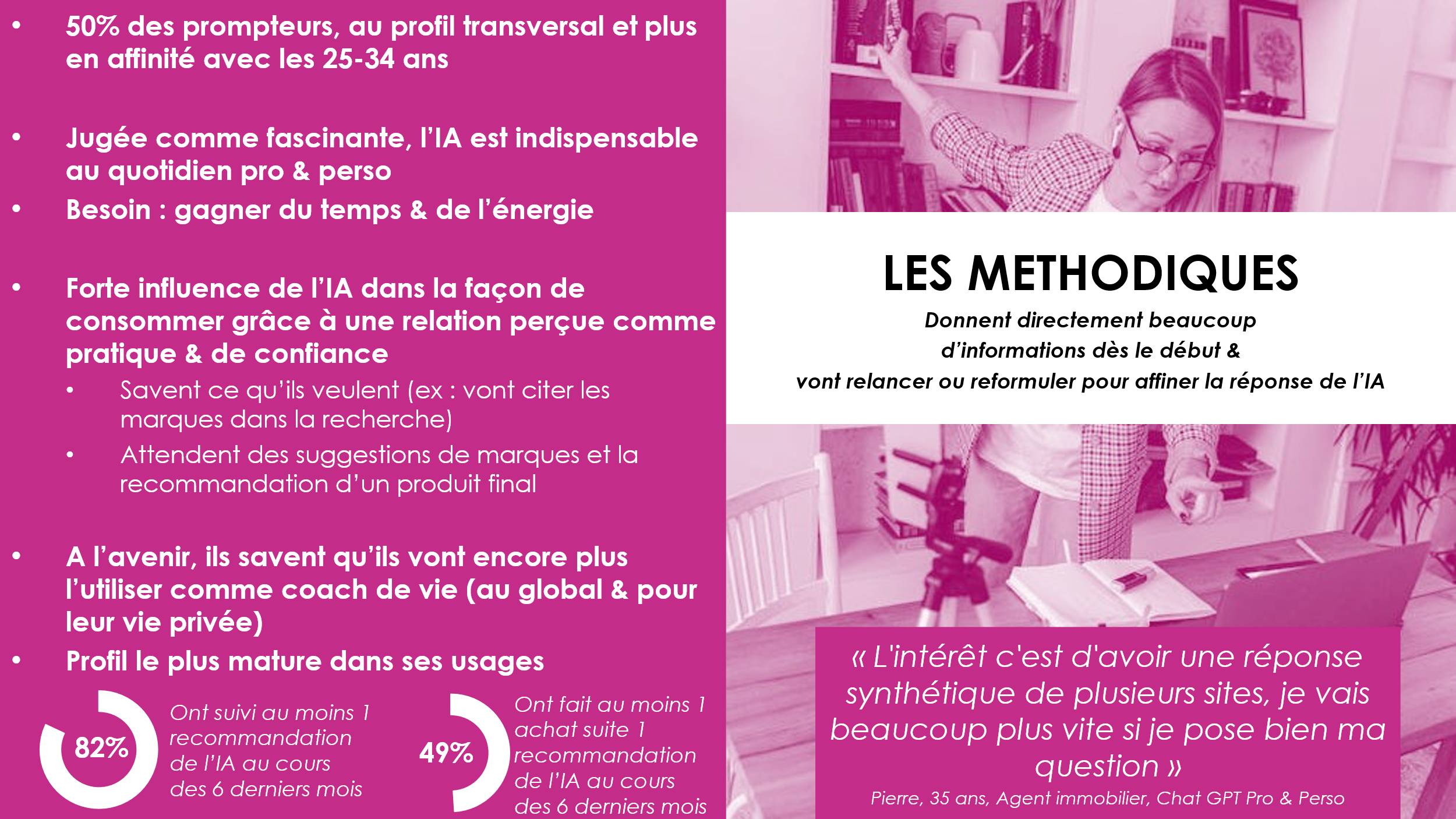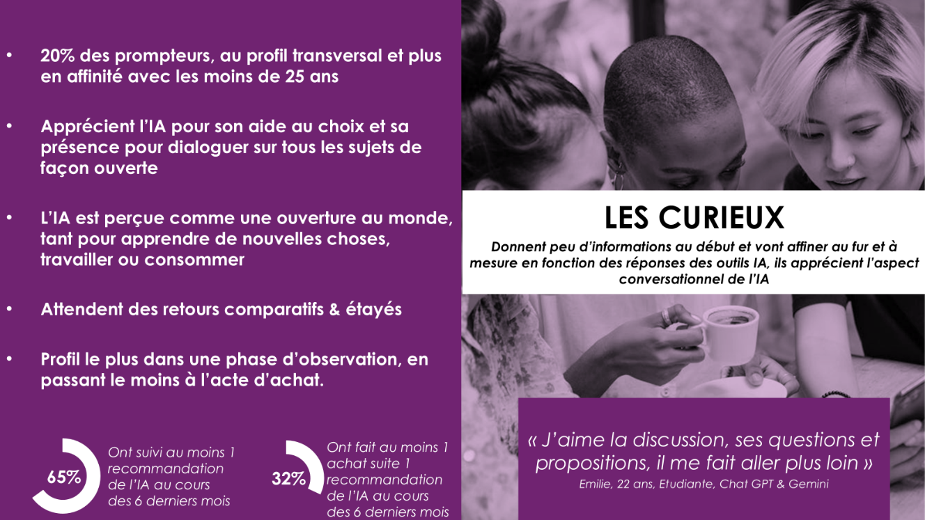 - Plus présents chez les 25-35 ans, CSP+, et utilisent l’IA aussi bien pour le professionnel que le personnel.