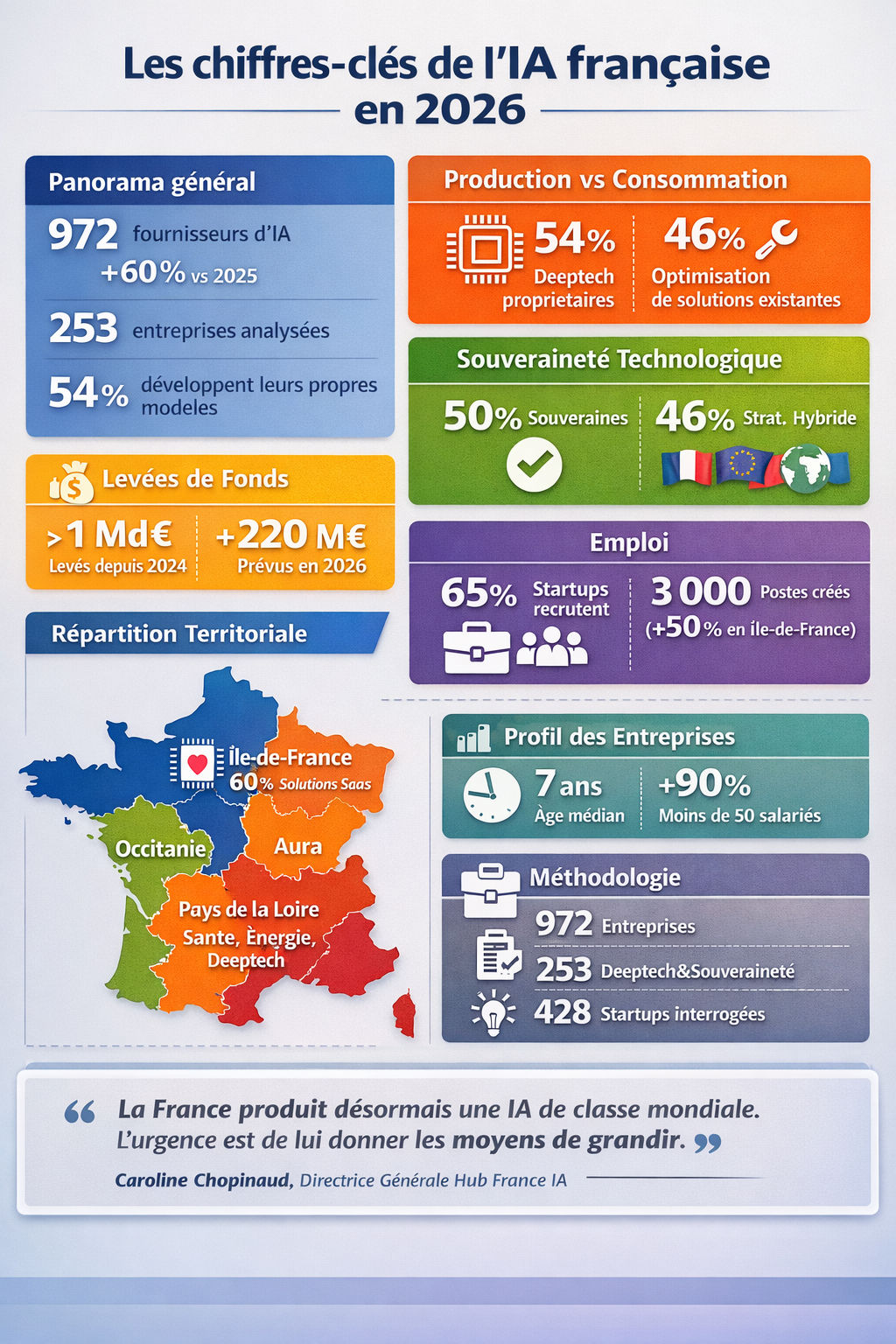 Lancée en 2020, la Cartographie Hub France IA en est à sa 6e édition. Le panel total porte sur 972 entreprises françaises actives dans l’intelligence artificielle, analysées sur la base de leur profil économique (chiffre d’affaires, effectifs, levées de fonds, part internationale), de leur positionnement sectoriel et de leurs pratiques environnementales. Les données relatives au positionnement technologique et au niveau de souveraineté sont issues d’un sous-échantillon de 253 entreprises ayant renseigné ces indicateurs spécifiques en 2026. Les données relatives aux prévisions de recrutement sont issues d’un sous-échantillon de 428 startups interrogées sur leurs intentions d’embauche pour 2026.