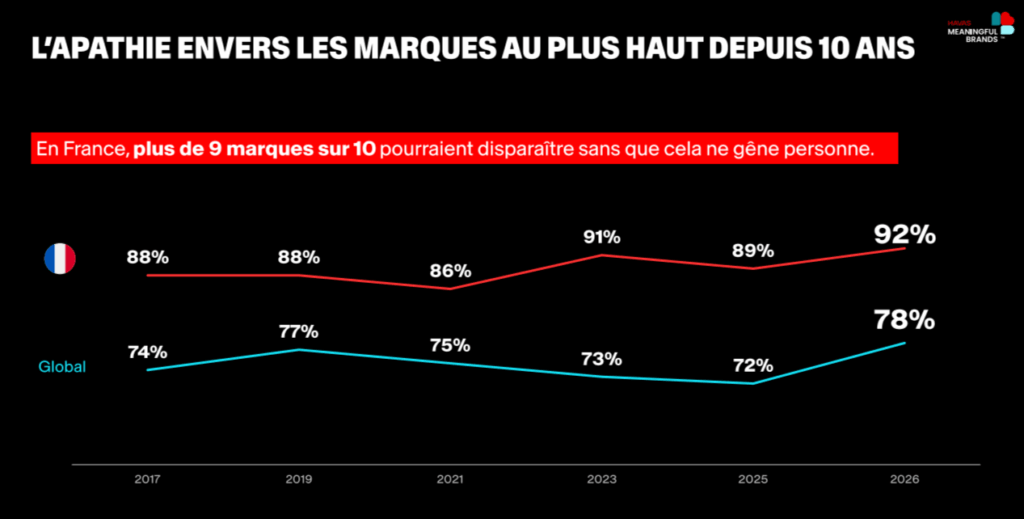 L’indifférence des consommateurs envers les marques atteint un niveau inédit. En effet, 92 % pourraient disparaître sans que cela ne les gêne.