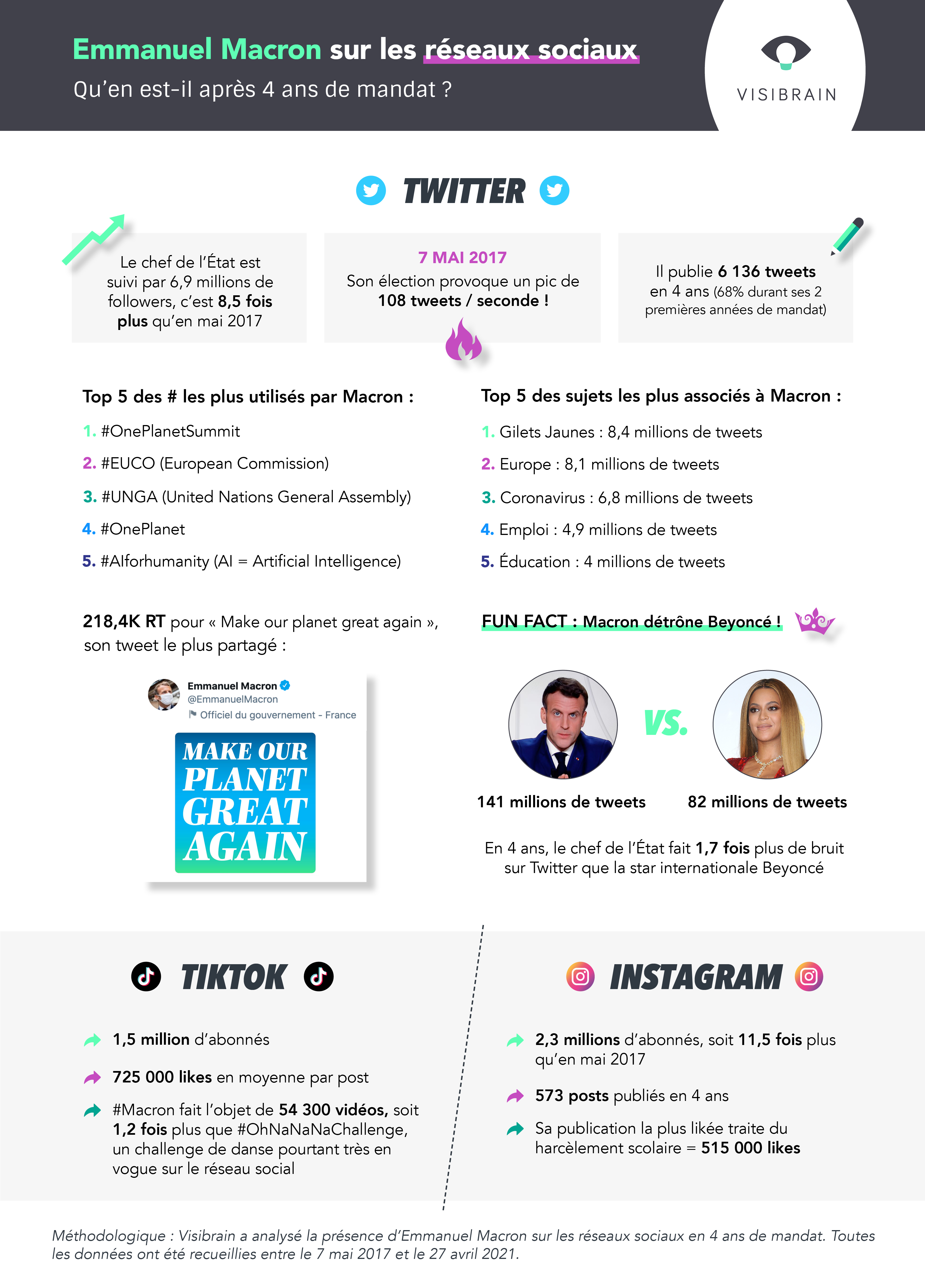 Twitter est d’ailleurs le réseau social sur lequel le chef de l’État est le plus suivi : 6,9 millions de followers, soit 8,5 fois plus qu’en 2017.