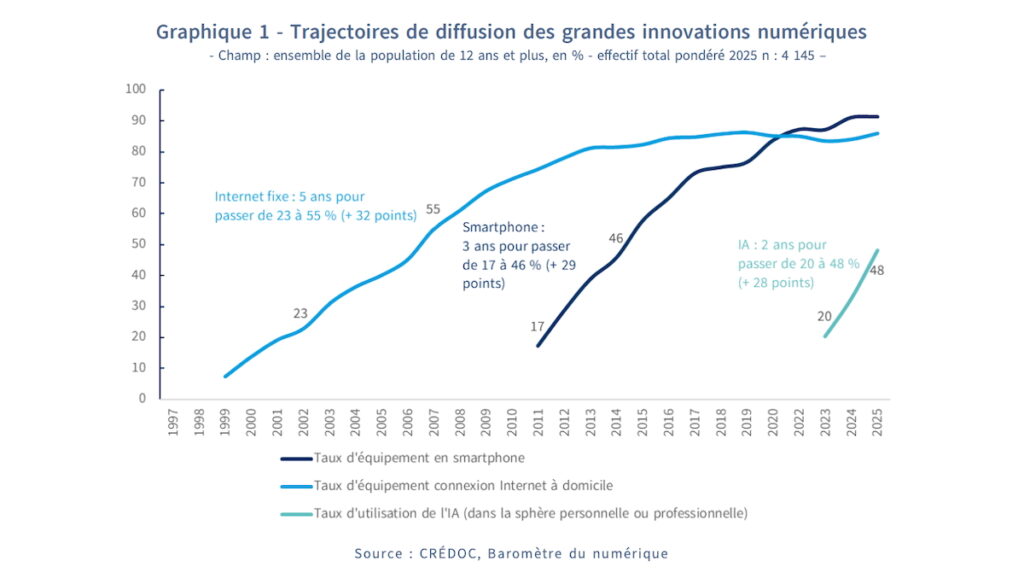 Cette adoption rapide surpasse celle du smartphone, qui avait nécessité sept ans pour atteindre un niveau comparable. L’usage est particulièrement marqué chez les jeunes adultes (85 %) et les cadres (76 %).
