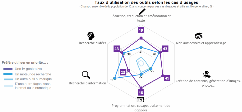 Chez les plus jeunes, son adoption à des fins scolaires est massive : 68 % des 12-17 ans et 73 % des 18-24 ans l’utilisent pour l’aide aux devoirs.