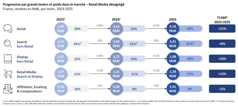 Le Social s’impose comme le principal moteur de croissance (+15 %, 4,18 milliards d’euros), représentant désormais 34 % du total.